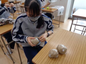明日は1,2年生合同のレクリエーションデーです。その内容の1つとして行われる、1,2年生対抗ボッチャ大会に向けて、今回のホームルームではボールづくりをしました。手作りなので、硬いものからやわらかいものまでさまざまなものが出来上がり、この違いが明日の勝負にどう影響するのか…