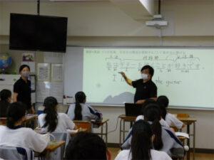 「日本文の構造を知ることで英作文に繋げる」をテーマに国語と英語のコラボ授業を行いました。まずは例文を文節、単語に分けて日本文を読み解きます。英語では動詞に分類されるlike=「好きです」は国語では形容動詞であることや、定冠詞であるthe=「その」は連体詞であることなど、国語と英語の文法の違いをおさえた後、英作文に移行します。言葉の入れ替えが可能な日本文とは違い、英語は語順が大切。動詞の時制にも注意しながら英作文に挑戦しました。これまで意識していなかった文の要素や語順のルールに気づくことができ、言葉の理解が深まる時間となりました。