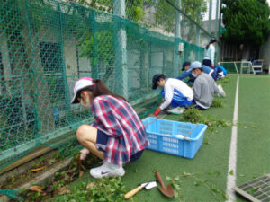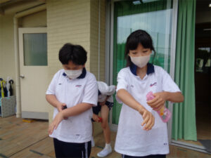 2学期のチロル学園合宿では、農作業を行う予定です。今日はその事前学習として、「身支度をする」「皆で作業の指示を聞く」「一定時間作業をする」という一連の流れを体験しました。まずは、虫よけスプレーを自分で腕や脚にかけるところからの練習です。除草作業に関しては、根っこから抜く、抜いた草はひとまとめにして置く、最後に集める、ということを意識しています。20分ほどの短い時間でしたが、よく集中して取り組めていました。今回の「働く」体験を、夏休みにつなげていけると良いです。