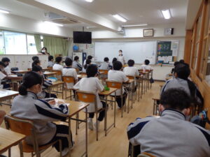 本校独自の教科である『生命科』は、「自分の存在の重さを知り、他の人の重さを感じることができる」という理想の生徒像を目標に実施されています。2年生の〈国際理解〉の単元のスタートとして、2週に渡り「SDGsスピーチ」をしていきました。SDGs17の目標の中から、各々が興味を持ったゴールについて自身の体験や調べてきたことを盛り込み、意見を発表しています。お互いの発表から新たな知識を得たり、考え方を知ったりする良い機会となりました。