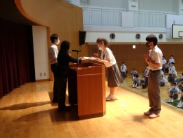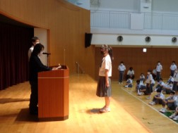 英検・漢検は、学校で受検を推奨し、学期に一度、準会場として多くの生徒がチャレンジしています。終業式では、それぞれの合格者を発表し、その努力をたたえるようにしています。今回は英検で、準1級の合格者が出たほか、2級に3名、準2級9名が合格しています。漢検でも2級・準2級に計11名が合格しました。画像は、代表して表彰を受ける英検と漢検の代表者です。