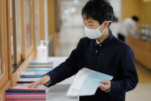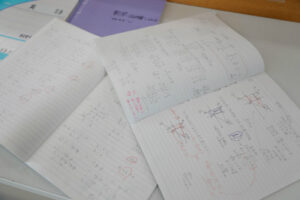 「自主学習ノート」は前回紹介した「プランノート」とセットです。生徒は、授業で使用する「授業ノート」と家庭学習で使用する「自主学習ノート」を教科ごと持っていて、プランノートで立案した計画をこのノートに実行します。授業内容を工夫してまとめたり、新たに調べた関連事項を書き込んだりします。また問題集を解いて、できなかったところを解き直し、解説を書き込みます。「自主学習ノート」も翌日、教科担当の先生に提出し、アドバイスをもらうのはプランノートと同じです。このようにして、プランを立てる→実行する→自己評価する→改善する、というサイクルを習慣化し、独自の学習スタイルを築き上げることで、自分を伸ばす力を獲得していきます。
