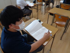 2年生の夏期講習が最終日を迎えました。この5日間は生活リズムを取り戻すと共に、既習内容を復習するのに良い時間となっています。特に各グループでの目標・課題に合わせて、数多くの問題演習に取り組んできたことで、学習する体力を養うことが出来ました。残りの夏休みもこのリズムを崩すことなく2学期を迎えて欲しいと思います。