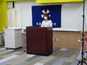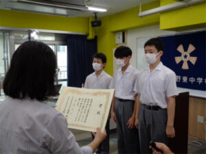 2学期がスタートしました。始業式は、全体で集まることはせず、生徒たちは各教室で、校長先生のお話を同時放映される映像を見る形で参加しました。校長先生からは、感染状況など今のような状況にある中での学校生活のあり方や、困難なことをチャンスに変えて自分を伸ばすことを考えていこうというお話がありました。また東京オリンピック体操で活躍した卒業生の村上茉愛さんの在学時代についても話があり、中学生としての今大切なことを生徒たちは感じることができました。また、夏の大会に出場した部活動の表彰や全国・関東大会での様子を映像で視聴し、活躍ぶりに拍手を送り、称えていました。