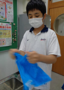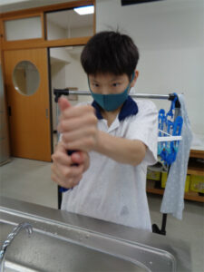 2学期最初の実習は被服でした。1学期に手縫いで進めてきた「刺し子の布巾」を手洗いし、チャコペンシルの線を落としました。洗い方は「もみ洗い」です。布を広げて軽く握り、布と布とをこすり合わせます。線が残っていないかを確認し、握る場所を少しずつ移動させながら全体を洗い終えたら軽くたたんで固く絞ります。それから、布をピンと左右に引っ張ったり、手に挟んで叩いたりして皺をのばして干しました。力の入れ具合やそれぞれの作業の意味合いの理解については、経験の差が出る様子でした。日常生活の中でも、靴下を洗ったり、タオルやハンカチを干したりして感覚をつかみ、手際よくできるようになると良いでしょう。