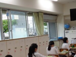 学校生活が軌道に乗ってきています。感染防止のため適度な距離感を生徒たち自身が意識して生活することは大切ですが、授業中やHR活動での換気は、授業者や担任が申し合わせて常に確認しています。本校の教室の窓は、外に面した部分も廊下側も非常に大きいのが特色です。明るく開放的な教室環境が、感染対策にも役立っています。
