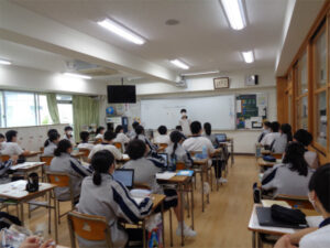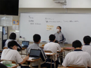 1学期に保健体育科とのコラボ授業から栄養バランスの大切さを学んだ2年生。1学期のうちに今の自分が補うべき栄養素について考えていました。そこで夏休みにはそれらの栄養素を含む食材を使ったメニューを作ってGoogleスライドでまとめるという課題を行っています。栄養素から考えたメニューをまとめることで、自身の調理を振り返りつつ普段の食生活を支えてくれる家族にも思いが至った様子です。2学期のスタートとして、この課題内容を発表し、必要な栄養素を補う食材やメニューの知識や情報を皆で共有しています。同じ栄養摂取を目標としても人によって選ぶ食材、メニューは様々です。来週も発表を続け、終了後にはスライドを掲示していきます。クラスを超えて多くのメニューに触れ食の知識を増やし健康な体作りを目指していきます。