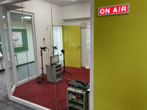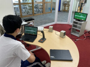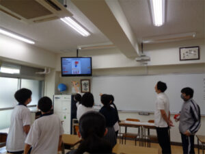 PR委員会では新しい校内掲示板の形を1学期より模索してきました。学校生活を活性化するための掲示板を目指し、生徒たちが考えたのはスライドを使用した掲示板です。スタジオから各教室のTVに放映します。週の予定や天気、部活や委員会の活動内容など様々な情報が集約されたデジタル掲示板は、見ごたえのあるものになりました。みんなの視線が集まるものとなり、委員も達成感を得たようです。