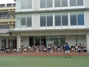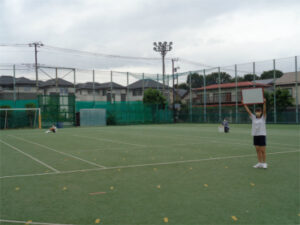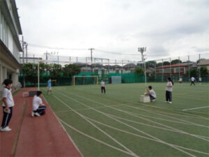 スポーツ大会に向けて、推進委員が大道具の搬入・搬出練習を行いました。マンフィールドを片手に、自分の役割と器具やマーカーの位置を確かめます。本番では、指揮台から全体へ指示を出す役割やアナウンスの役割もあり、生徒が主体となってこの行事を運営していきます。
