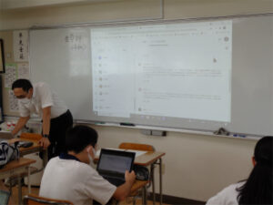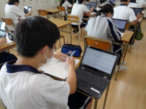 前回の生命科では一人一人、原爆投下が「終戦のためにやむをえなかった」か、「何があっても避けるべきだった」かを考えました。そこで今日はGoogleクラスルームを使って意見を共有することにしました。クラスメイトの考えを知って思いが変わった生徒もあり、対面でのディスカッションが難しい中でも、学び合いの意義が感じられる時間でした。答えのない問いに対しても自分の意見を持って理由を説明できること、そして様々な考えを持つ他者と考えを伝え合えることを目指します。