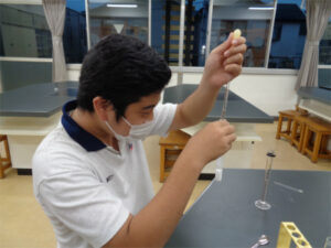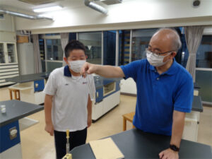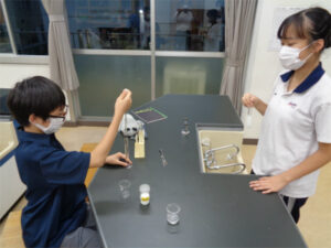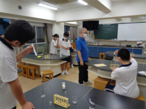 放課後の理科室から生徒たちの声が聞こえてきます。科学研究同好会(通称「科研」)が、『飽和食塩水にエタノールを入れるとどうなるか?』という実験を行っていました。「白くなってきた」「二層に見える」「それはまだ、初期段階だよ」「雪が降っているように見えるはず」などなど、知ることを楽しむ、そんな声が響く放課後の理科室でした。