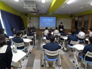 社会科見学講座は、希望者が博物館や新聞社などを見学して社会科分野に関わることを学ぶ講座ですが、コロナ禍の今年度は、国連UNHCR(国連難民高等弁務官事務所)協会・ファンドレイザーの天沼耕平氏をお招きして、出張授業をしていただきました。