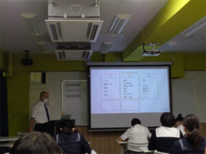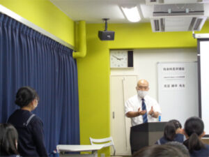 前半は「いのちの持ち物けんさ」というワークショップを行い、大切なものを失ったとしたらどのように思うかを想像して、喪失の疑似体験をしました。後半は、天沼先生が実際に訪れた海外での体験談を交えながら、難民の現状について講義をしていただきました。参加した生徒たちは、私たちにできることは、「知る」・「広める」・「参加する」・「寄り添う」こと、という天沼先生のお話に真剣に耳を傾けていました。