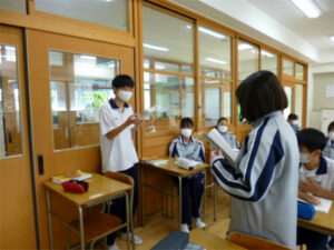 買い物の際の、店員と客の英語でのやりとりを教科書で学習しています。既習の文法事項を使って、店員側は提案をしたり、客側は自分の好みを伝えたりできるよういろいろな表現を口頭練習した後、ペアになってオリジナルのスキットを作成し発表しました。I’m looking for a T-shirt.などの文で現在進行形の復習をするとともに、May I help you?やHow much?などの定型表現を覚える良い機会になりました。