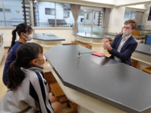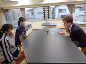 ALTのビル先生との会話タイムは、主に放課後の時間に2人ずつ行っています。1年生との会話タイムの始まりを覗いてみると、先生から‟No Japanese!(日本語を使っちゃダメ)”との宣言がありましたが、それに動じる様子もなく、楽しそうに英会話が進んでいました。