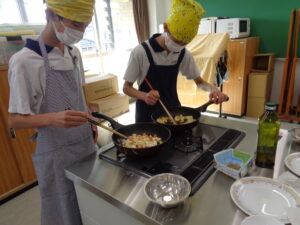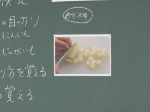 実習では、様々な作業を通じ、技術や集中力の向上を図っています。今回は調理実習で、ジャガイモと人参をさいの目切りにし油を多めにしいたフライパンに入れ、揚げ焼きにしました。前回まで長ネギの小口切りや大根のイチョウ切り等なるべく薄く切るよう意識していたので、ある程度厚さのあるさいの目切りには少々苦戦していたようです。またフライパンに入れる際は油がはねないよう低い位置からいれるようアドバイスしました。次回も行い、さらにスムーズに作業できるようにしていきます。