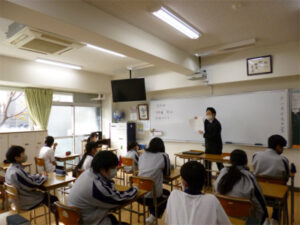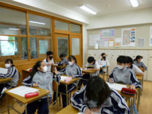 1年生の生命科では「友愛」「生命」に続き「将来観」について学びます。その1回目となる今回は、「あなたが今、興味のある職業は?」「仕事のやりがいとは何だと思いますか」など、将来への意識を問うアンケートを実施しました。生徒たちは、分からない言葉の意味などをお互いに教え合いながら、それぞれの将来について真剣に考え、一つ一つの質問に答えていました。次回は、今回の内容について意見交換を行う予定です。