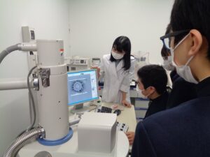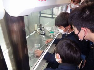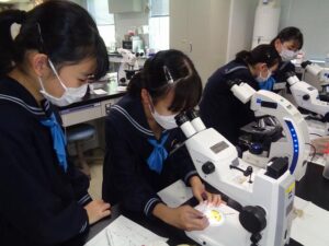 希望者対象の科学講座「サイエンスラボ」の企画として『植物の病原菌観察教室』を、法政大学の生命科学部応用植物科学科の実験室にて開催しました。担当の先生より植物の病原菌の研究が食糧問題でどのように生かされているか、また今後の問題点などの講義があり、その後学内の施設を見学しました。また多種類の植物や菌が培養されている装置などを見たあと、クワのうどん粉病菌を光学顕微鏡と電子顕微鏡で観察しました。葉より病原菌を採取しプレパラートを作る作業は生徒たちも真剣です。菌を培養する作業も体験できました。電子顕微鏡での画像は、「こんなところまで見えるのか」と感動の声があがっていました。最後に生徒たちが観察結果をプレゼンする機会もあり大変有意義な時間になりました。
