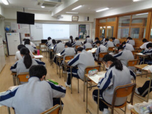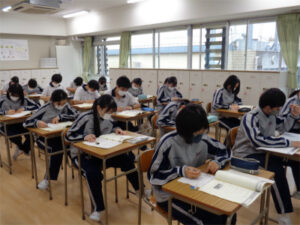 歴史用語検定は、年5回授業内で実施している校内検定で、5級からスタートして最高位7段を目ざします。生徒たちは、合格に向けて計画を立て、実行した自主学習ノートを提出することで力をつけていきまします。一問一答形式のテストで、受検級が上がるたびに出題範囲が増えていくため、歴史の基礎力強化につながっています。
