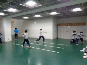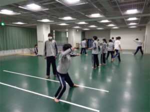 2月に行われる発表会では、音楽や武道、ダンスの発表が行われます。今回は、武道の部の練習風景をお伝えします。1年生は、集まって何やら相談をしてる様子。演技構成のなかで、生徒たちが自分たちで振りを考える「創作」の活動をしていました。2年生は二人一組で、こちらも自由演技の部分を「創作」しています。このような生徒たちの主体性を伸ばす活動を取り入れることで、創造性を育むとともに本番での生き生きとした演技につながっていきます。