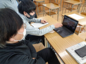 学校内での新型コロナウィルス感染の広がりは抑えられていますが、東京都の感染者数増加の状況を鑑みて今週末はMeetを使った授業に切り替えています。朝のHRでは健康状態や通信環境の確認をしたあと、担任が家での様子などを一人一人聞いていました。多くの生徒が、学校で貸与しているクロームブックを持ち帰ることで、オンラインでの授業もスムーズに行えています。