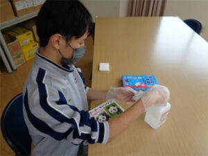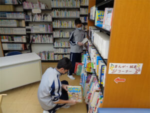 図書室での本の貸し出しや返却、返却された本の消毒、返却された本を本棚に戻す作業は、学校生活委員会の生徒たちが担っています。コロナ禍では、物の共有に特に気を付けていく必要があり、本の消毒についてもビニール手袋をして一冊ずつ丁寧に作業をしていました。生徒たちが気持ちよく本を借りられるのも、委員会の生徒たちの「仕事」のおかげです。