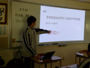 1年生の生命科では、職業についての知識の幅を広げることを目的に、「職業調べ」を行っています。これまでの授業で、それぞれが「現時点では自分の将来の夢ではない=あまりよく知らない」職業について調べ、3分程度のプレゼンテーションができるように準備を進めてきました。今回のプレゼンテーションを通し、生徒たちはクラスの人数分の職業についての発表を聞くことになります。職業の名前は知っていても、その内容や実態については知らないことが意外とたくさんあり、発表を聞く生徒たちからは驚きの声が上がっていました。