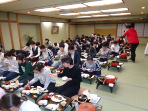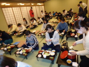 無事ホテル(ギオン福住)に到着し、ホテルの方にプロジェクトリーダーから挨拶をした後、部屋での着替えなどを済ませ、夕食をとっています。食事中はもちろん黙食。集中して食べています。いろいろあった一日でしたが、現在皆元気に過ごしています!