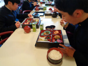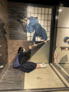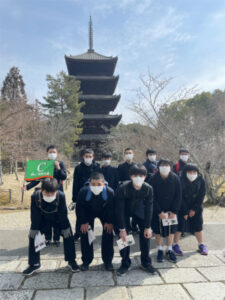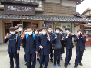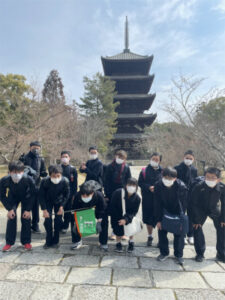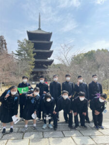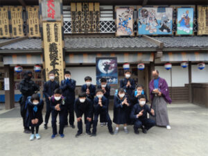 2日目は、やや肌寒いながらよく晴れた日となりました。今日は修学学習のメインとなる日ですが、AB組は班ごと見学地をタクシーで巡り、CDE組は金閣・仁和寺・太秦映画村を貸し切りバスで訪れました。CDE組はやはり映画村が楽しかった様子で、食事の後クラスごとにいろいろなアトラクションを楽しみました。忍者や武士に扮した役者とも写真を撮り、ご家族の方へのお土産などもしっかり買ったようで、相当満足した表情が見られました。