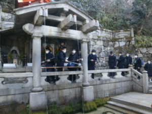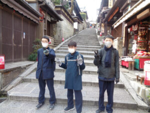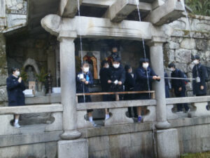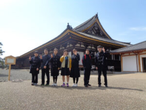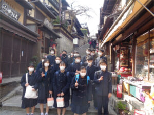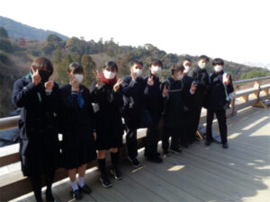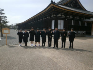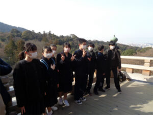 京都奈良プロジェクトメンバーです。最終日の行程を終え、今、新幹線に乗っています。今日3日目はA~E組合同の学習班で清水寺、方広寺、三十三間堂を見学しました。清水寺では、有名な舞台や音羽の滝に行きました。清水の舞台では、京都市内を一望でき、東京にはない景色だなと思いました。次に行った方広寺では「国家安康、君臣豊楽」の碑文が入った有名な鐘を見ました。大坂冬の陣が始まるきっかけを作った鐘であり、歴史の一部を垣間見ることができました。最後に行った三十三間堂では、千手観音の数の多さに驚きました。昼食もとてもおいしいご飯をゆっくり堪能することができ、京都に来てよかったなと思いました。教科書やインターネットよりも数百倍美しいものを見ることができ、本当に感動しています。三日間、協力し合った友人たち、支えてくださった先生方、京都・奈良のみなさん、ありがとうございました。(A.T N.K)
