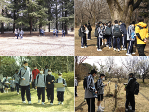 は,小金井公園にて「この木なんの木?」。班に分かれて目標の樹木を探しながらのウォークラリーを行いました。あらかじめ目標の木には番号がつけられているので,それを見つけたらヒントを頼りに樹木名を用紙に記入していきます。樹木には名札がつけられているものもありますが,ないものもたくさんあり,一筋縄ではいかない難しさがありました。枝振りの似た木や葉のつき方が同じ木を探し,工夫をしながら進めている班が多かったようです。東コースと西コースがあり,全部で67種類,全行程約4kmのコースをたっぷり歩きました。初めての校外での班活動でしたが,協力して楽しんでいました。