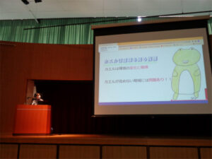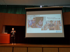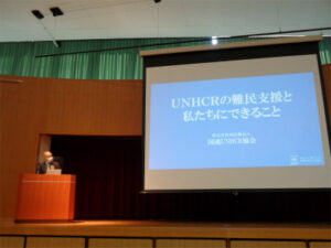 今年度2度目となるSDGs Dayは、SDGsプロジェクトの報告会と、天沼耕平さん(国連UNHCR協会)による講演会の2本立てで実施されました。前半の報告会では、活動内容の報告に加え、プロジェクトメンバーが取り組んできた「太陽光発電施設の見学」や「レインフォレスト・アライアンス認証」などについての発表も行われました。後半は、「特別セミナー ~UNHCRの難民支援と私たちにできること~ 」というテーマで、UNHCRの難民支援活動について、自身の経験を交えながらお話していただきました。生徒たちは天沼さんの熱い想いのこもったお話に冒頭から引き込まれ、真剣な表情で聞き入っていました。難民問題を他人事にせず、まずは「知る」「広める」「参加する」ことから始めてほしい、という天沼さんのメッセージは、確実に生徒たちの心に響いたことでしょう。