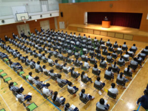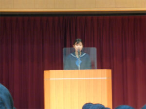 英語スピーチコンテストが校内にて行われ、予選を勝ち抜いた17名が本選に出場しました。1年生は”My favorite”、2年生は”My Memory”、3年生は”My opinion on SDGs”のテーマで発表します。審査のポイントは内容、英語力、表現力を含めた「伝える力」です。英語の流暢さはもちろん、表現においても工夫が見られ、ハイレベルな発表となりました。特に3年生は世界の諸問題について自分なりの解決方法を強く訴えるスピーチばかりで、3年間の中学校生活・英語学習の集大成といえるものでした。発表を聞いた下級生は多くの刺激を受けたようです。