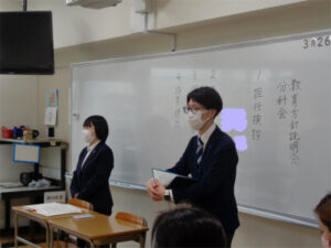 2022年度の教育方針説明会を開催しました。進級書類を手渡した後、今年度の学園・中学校の教育方針や重点についてお話しし、その後教職員紹介などを行いました。クラスごとに分かれた分科会では、担任から自己紹介や今年の抱負などについての話があり、和やかな雰囲気で会が進んでいました。いよいよ2022年度のスタートです。保護者の方々の協力を得ながら、新しい年度の教育を推進していきます。