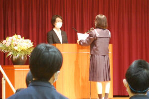 暖かな春の日差しのもと、新入生101名を迎え、第40回入学式が行われました。担任の先生から一人ひとりの名前が呼ばれると、元気な返事で答え中学生として確かな一歩を踏み出しました。また、在校生を代表して総務委員の生徒からも歓迎の言葉が述べられました。明日からいよいよ本格的な中学校生活がスタートします。