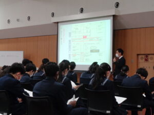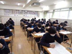 3年生はいよいよ進学に向けた取り組みが本格的に始まります。今日はそのためのオリエンテーションと、来週から始まる「特別進学学習」に向けたテストを行いました。 進学オリエンテーションでは、先日の教育方針説明会で保護者向けに説明したものを、生徒用にアレンジして話しました。受験・進学の当事者である生徒自身に、その自覚・理解を正しく持たせることを目的としています。生徒達は改めて気持ちを引き締めると共に、一年間のおおまかな流れ、特別進学学習や模試などの仕組みについて理解を深めました。 受験までの流れや心構えを共有したことで、生徒たちはより一層気合いが入った様子です。この高い意識を継続させつつ、来週月曜日から特別進学学習についてもスタートしていきます。