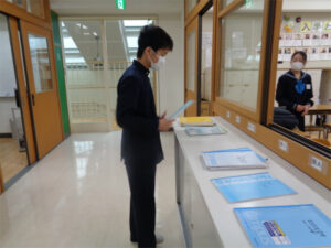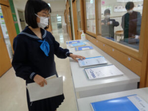 1年生の授業も軌道に乗り、自主学習を積極的にスタートさせています。家庭学習を行ったら、翌日「自主学習ノート」を教科の先生に提出し、コメントや評価をもらいます。画像は、登校後クラスの所定の場所に自主学習ノートを提出している1年生の様子です。自学自習の力を養い、自分を伸ばす学校生活が始まっています。