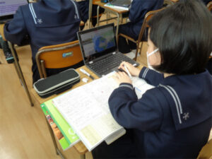 1年生の社会科・地理では世界の国々について学んでいます。今回は、自分で興味を持った国について調べました。まずは地図帳で、首都名や人口、面積、おもな輸出品などの基本データを収集します。その後、クロームブックなどを用いてその国で有名なことや盛んな産業について、グラフや資料を示して説明しました。1つの国について詳しく調べて分かったことで、これからいろいろな国への関心が高まり、新たな「問い」につながっていくことを期待しています。