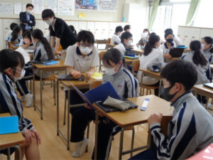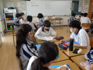 探究科とは、「知りたい」と思うことを「問い」にして、オリジナルの「答え」を構築していく、本校独自の教科です。2年生は現在、1年次に学んだ基礎をもとに、各自がオリジナルのテーマを設定して探究していく「個人探究」の活動を進めています。今回は少人数のグループに分かれ、それぞれが自分のテーマと、これまでの文献調査から分かったことを発表しました。個人探究は生徒一人一人が自分の力で行うものですが、定期的に設けられる成果発表の場で友達から良い刺激を受け、お互いに高め合いながら進めていきます。