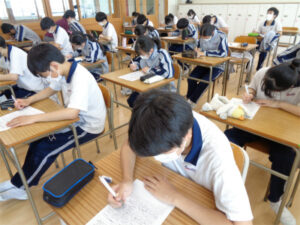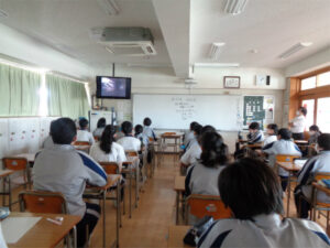 今回は視覚教材を使って広島の原爆について学びました。広島の資料館にある被爆者の遺品からは被害にあった人々の苦しみが伝わってきます。原爆の熱線や爆風、放射線が与えた影響はあまりにも残酷ですが、日本で本当に起こったその事実をしっかりと胸に刻みました。唯一の被爆国である日本。「その国民としてその歴史を知り、2度と同じことを繰り返さないために自分たちができることを考え、後世にも伝えていかなければならない。」という感想が多くありました。