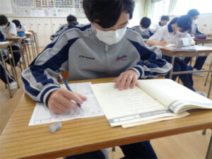社会科では、1年生から3年生まで共通の進級式のオリジナル検定=「歴史用語検定」(略称‟歴検”)を年5回行っています。この‟歴検”は、出題範囲が常にテキストの初めからとなっていて、繰り返し最初に戻って復習を重ねながら、学習範囲が広がっていくところが特徴です。3年生は今回6段まで進んでいる生徒がいて、次の7段に合格すると最高位の認定証が授与されます。この検定を繰り返すことで、歴史事項の基礎力が着実にアップしていきます。