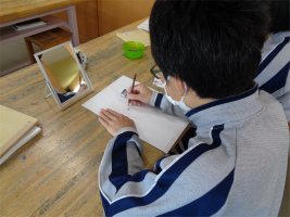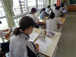 3ABが取り組んでいる自画像は、自分を見つめてテーマを考え、それを表すポーズや構図を探りながら下絵の制作を進めています。じっくりと鏡やポートレートを見ながら描き進めていく中で、興味や関心、また将来について考える機会となり、いろいろなアイデアが生まれてきています。人物を描くポイントを掴み、中学生活の集大成として、これまでに学んだ表現方法や技法を活かして完成を目指します。