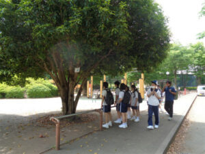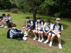 小金井公園ではクラス混合のチームに分かれ、ウォークラリー「この木なんの木?」を実施しました。数字の書いた樹木を探し、樹の名前を用紙に記入していきます。樹皮や枝葉の特徴を観察しながら、同じ種類の名札のついた樹がないか、班の生徒で協力して探す様子が見られました。天気にも恵まれ、汗ばみながらの2時間はあっという間だったようです。ABとCDE合同での初めての校外活動でしたが、互いに理解を深める良い機会になりました。