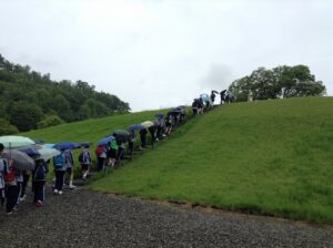 最終日は、山梨県曽根丘陵公園での活動です。到着後は、クラスごとに銚子塚古墳(東日本最大級の前方後円墳)・丸山塚古墳と山梨県立考古博物館の見学を行い、石器時代・縄文時代の文化を肌で感じることができました。