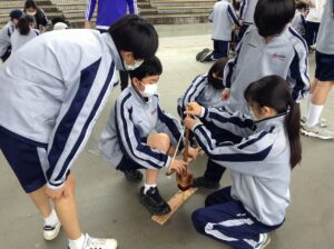 昼食後は施設の方の説明のもと、A~E組の混合班で火起こし体験が行われ、1日目・2日目同様、ここでも班ごとの協力態勢が発揮されています。