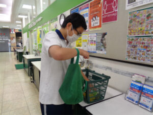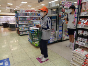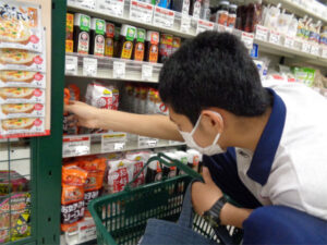「体験・実習」は2時間続きの授業で、実生活に必要なスキルを経験を通して学んでいきます。今日の体験は「スーパーマーケットでの買い物」でした。事前にクラスで買い物の一連の流れについて確認してから臨みました。入店から棚の表示を見て商品を選び、足元の印を見てレジに並ぶところまではスムーズにできていました。レジで、店員さんにカゴを渡し、表示された金額を支払い、お釣りを受け取り、サッカー台に移動するというところはより速やかにテキパキとできるようにしていきたいところです。また、レジ袋の要・不要については店員さんから「レジ袋は要りますか?」と聞かれる場合と、「袋はありますか?」と聞かれる場合があるので、質問に応じた受け答えをするというのもポイントでした。これからも経験を通してスキルを高め、買い物の幅を広げていきたいと考えています。
