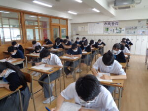 3年生は1,2年生に先駆け、1学期の中間テストを行いました。受験生として初めての定期テストということもあり、生徒たちはこれまでより高い意識で対策し、本番に臨んでいました。これまでプランノートに沿って計画的に進めてきた学習の成果を発揮してほしいです。