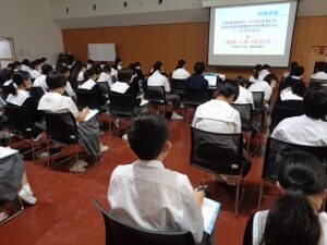 1、2年生AB組を対象に、自転車交通安全教室を実施しました。生徒たちはDVDの視聴の後、スライドを用いた説明を聞き、各自のワークシートに交通安全のルールや、事故を起こした場合に問われる責任などについて熱心に記入しました。今回の学びを活かして、今後も安全に自転車を利用してほしいと思います。