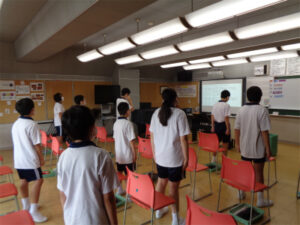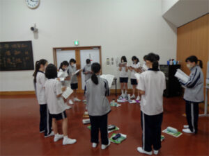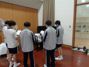 7月の校内合唱コンクールに向けて、今月から各クラス本格的に練習を始めました。今回の授業では、パートに分かれて音取りをしています。うまくできない部分を重点的に繰り返し練習するなど、自分たちで課題を見つけ、克服しようとしている姿が見受けられました。毎回の授業で書く振り返りシートには、「できなかったところが歌えるようになって嬉しい」といった感想がありました。