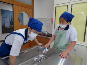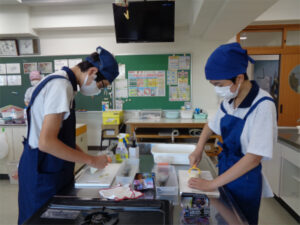 「実習・体験」は2時間続きの授業で、生活に必要な技術を経験を通して身につけていきます。2年生になって初めての調理実習では、「人参と大根のきんぴら」を作りました。今回は、身支度や衛生面の確認、「ピーラーの使い方」と「いちょう切り」の包丁検定、ラップの切り方、電子レンジの使い方、洗い物と調理台の片づけなどにポイントを置いて取り組みました。どの生徒も昨年度の経験や家庭での積み重ねが活きている様子でした。次回からは、包丁の更なるスキルアップを図るとともに、計量スプーンを使った計量なども行っていく予定です。